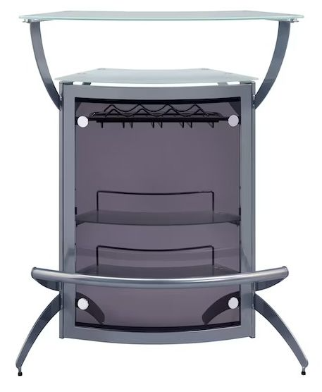The contemporary curves of its metal frame add a sleek, sophisticated aesthetic, while transparent smoked acrylic panels put your glassware collection on proud display. A frosted, tempered glass top finishes off its bold, modern look. Featuring a handy metal rack for stemware and multiple shelves, this unit easily accommodates a wide variety of bar accessories.