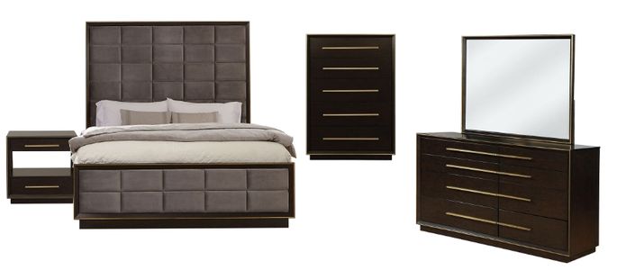 Set Includes - Eastern King Upholstered Bed, Dresser, Mirror, Chest and Nightstand